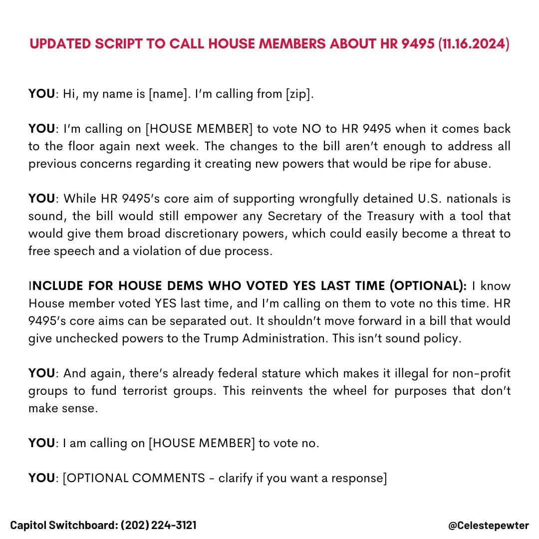 The House voted on H.R. 9495 on November 12th, and fortunately it failed to secure the 2/3rds majority it needed; but they're immediately trying again, which should worry us. On Monday it goes to the Rules Committee for a hearing in which members may approve or disapprove and propose amendments. If it passes the committee, it will come back to a full floor vote on Wednesday. This time, it will only need a simple majority. (The Intercept has several good articles on this, one from last week here and one about the upcoming attempt here, which go into more detail on the goals of this bill and why it's scary.) They attempted to ram this same bill through in September as well. The ACLU and a diverse array of over 130 other tax-exempt organizations — including human rights, reproductive health, and immigrants’ rights groups — wrote to Congress urging them to vote no. (That letter is here, and is worth reading in full.) The persistence is the most alarming part of this; Trump wants this very, very badly, and we cannot give it to him or all of us are screwed.