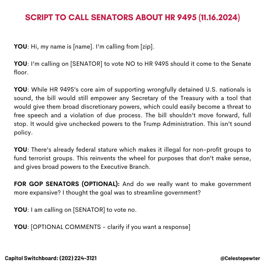 You may or may not have seen this in the news, but a bill was sent to the House floor last Tuesday which would essentially have granted the Trump administration the power to direct the IRS to take away 501c3 tax-exempt status from "un-American" nonprofits. H.R. 9495, the "Stop Terror Financing and Penalties on American Hostages" Act, started out as an objectively good thing which already passed the Senate on its own, and which Biden was ready to sign. (Did you know that you're still subject to IRS tax penalties if you are a U.S. citizen who is taken hostage by terrorists??? Because I did not, and that seems like something we should fix!)